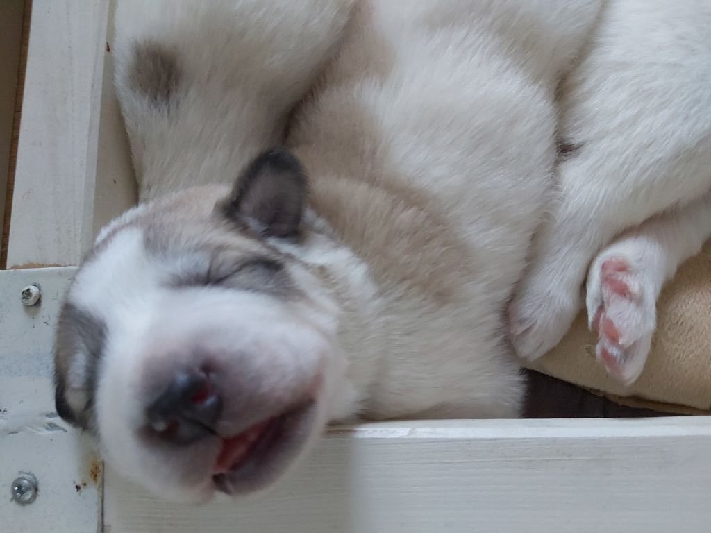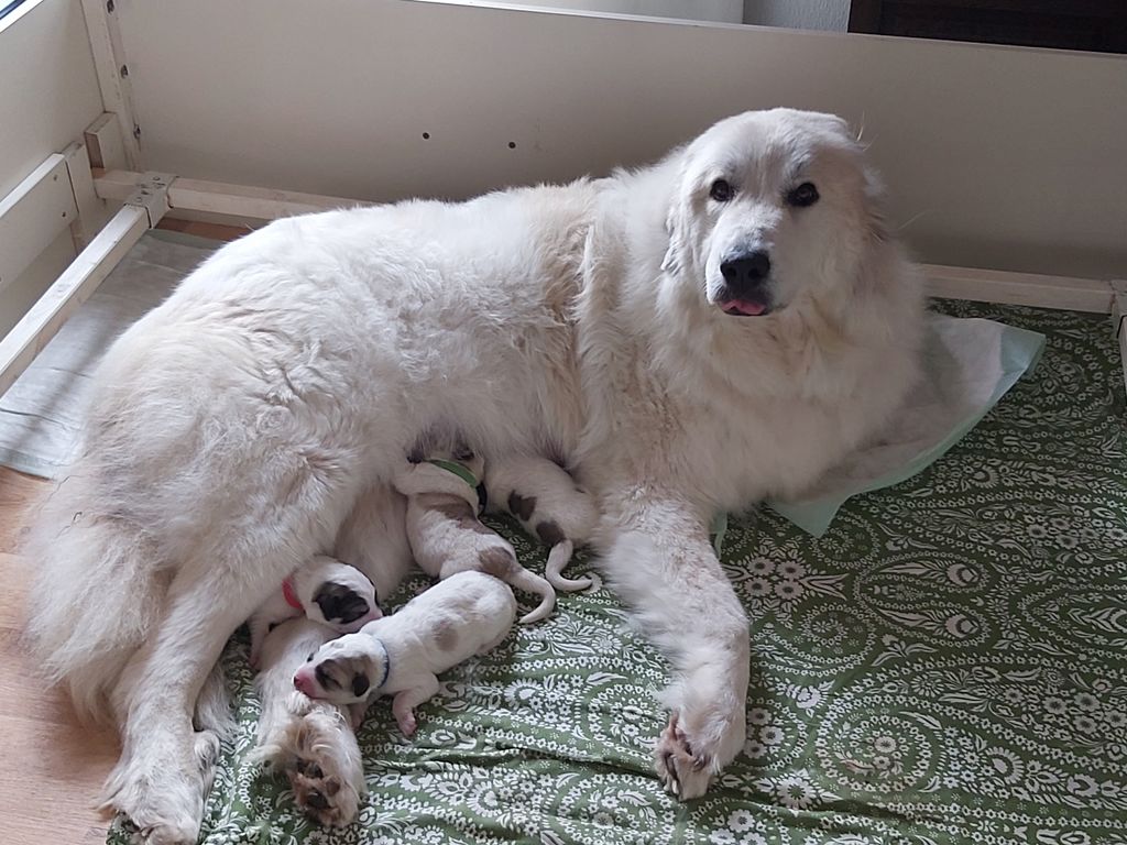 Die erste Lebenswoche der Welpen ist vorbei. Noch besteht ihr Tag aus Trinken und Schlafen. Ihr Geburtsgewicht haben sie bereits verdoppelt und die Näschen sind schon fast schwarz. Auch die Füßchen bekommen schon schwarze Flecken. Siri ist auch schon recht entspannt, auch wenn sie Welpen-Oma Asya noch nicht ganz an die Welpen lässt.