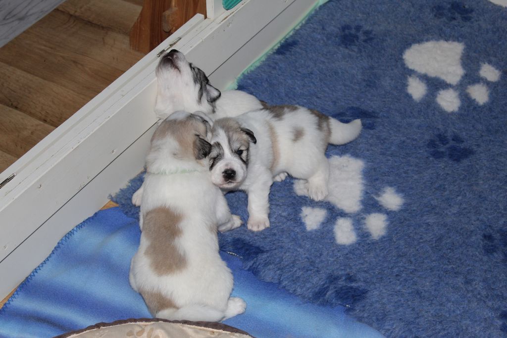 Jetzt sind die Welpen bereits 3 Wochen alt. Noch immer schlafen sie die meiste Zeit des Tages. Aber sie spielen auch schon gezielter. Sie bellen und knurren und kommen angelaufen, wenn wir oder Mama kommen. Ihr Geburtsgewicht haben alle Vier mindestens vervierfacht.