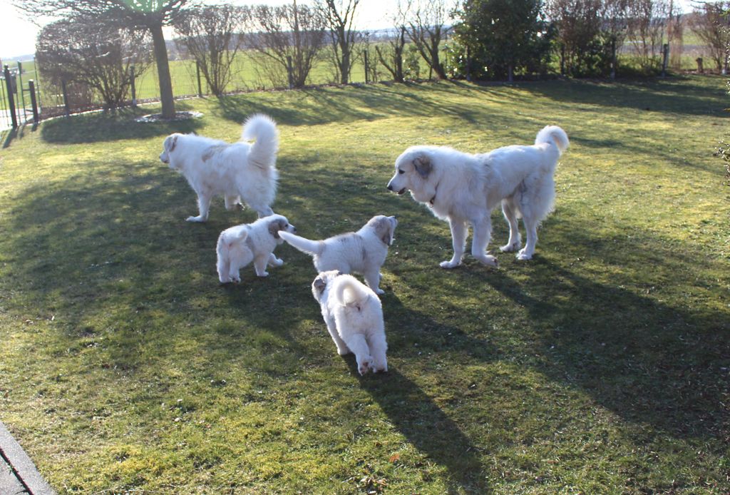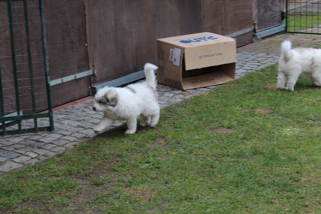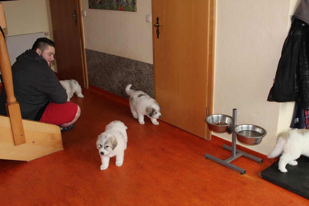 Jetzt sind sie schon 6 Wochen alt und mächtig gewachsen. Wenn es das Wetter erlaubt, sind sie tagsüber draußen. Drinnen wird es ihnen auch zu langweilig, daher wird auch schon mal der Flur erkundet. Und zum Wochenende sind die Welpen jetzt tagsüber ins Hundereich umgezogen - mit Indoor - Spielplatz und beheiztem Innenraum sowie Freilauf. Aber zum Schlafen geht es noch zurück ins Wohnzimmer.